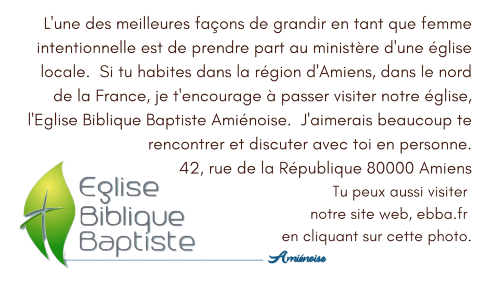 Bien que les hommes soient les bienvenus pour lire les articles et commenter, sachez que le désir de mon cœur est d’encourager les femmes uniquement. Merci pour votre compréhension !